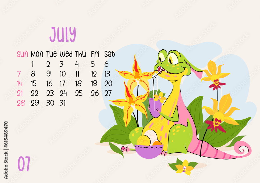 Source : www.funtazmo.comHorizontal calendar page for July 2024 with orchid green dragon